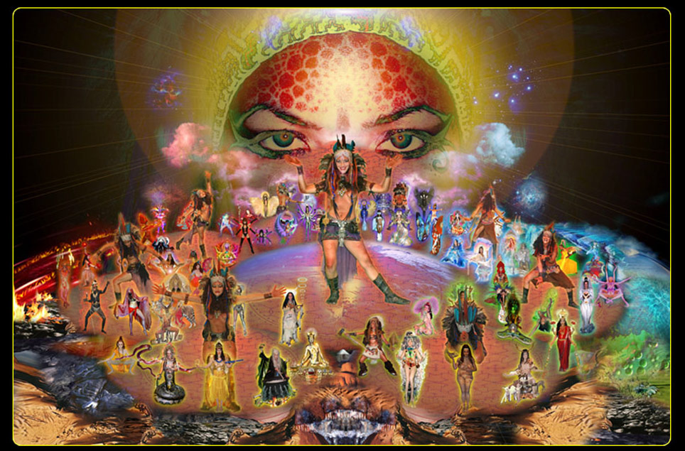 Tribali is the Dakini who represents the synthesis of the new tribalism represented by the cycle of 64 Dakinis. She is a pan-ethnic being, holder of the vibration of the family in the new paradigm reality. She holds sacred the ways of the indigenous peoples and blends the best of the old and the new in her ancient future stance. She holds all the circles together because she is a queen of a new reality which does not discriminate on the basis of color, creed, gender, culture or religion. She does not hold the circles of affinity together based on hierarchies of power. She allows freedom of choice and the laws of natural selection to be the self-determining factor in circles based on affinity and resonance. She holds the space for all sovereign beings to dance together the great dance of co-creation in celebration.
